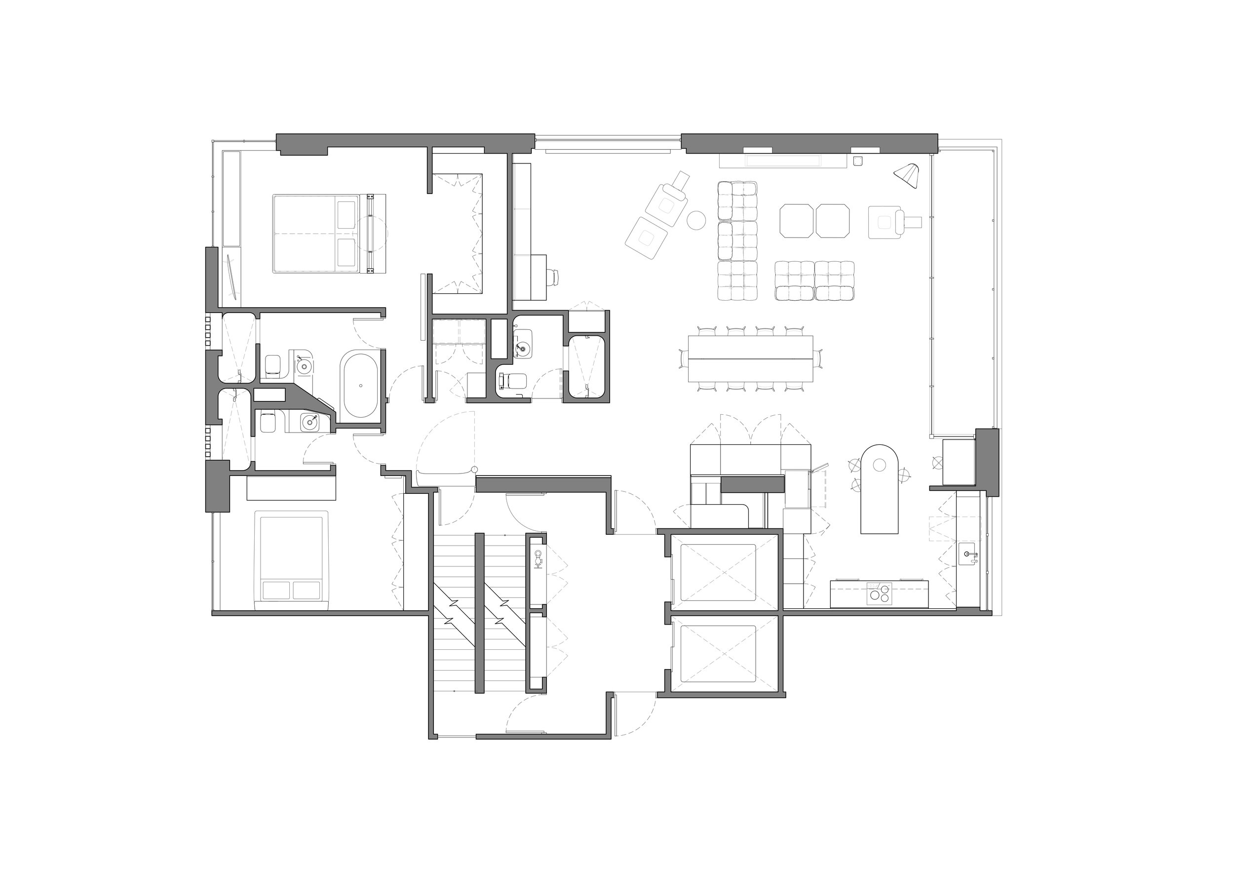 The project begins with subtraction. Layers of alteration accrued over time are removed to reveal the original spatial generosity of the apartment, allowing volume, light and view to reassert themselves. With expansive outlooks to the east, north and west, the interior is recalibrated so that the landscape becomes the primary occupant, and the inhabitants its audience.