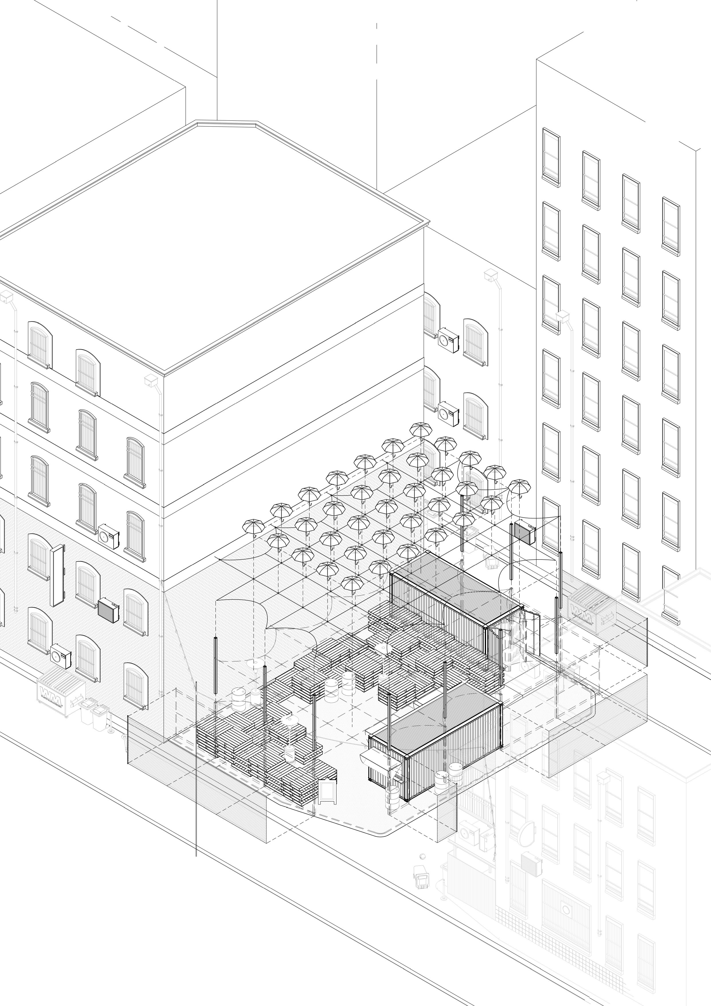 Section 8 stands as a robust response to an overly refined archetype. Notably, Melbourne's bar culture tends to be disconnected from the urban fabric, existing in its own secluded realm. This project cleverly embraces its temporary nature and limited resources, showcasing the theme of impermanence. It becomes intertwined with the city, embedded in the underlying urban landscape. Through the transformation of 100 pallets into decking, seating, and tables, as well as the suspension of 50 umbrellas creating partial enclosure, the project captures the essence of transience. A single shipping container serves as a bar, while another provides necessary bathroom facilities.